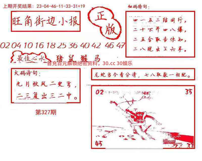 | 327期 | 虎 | 蓝波双 | 6尾 | 开蛇37 |